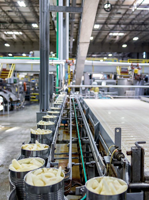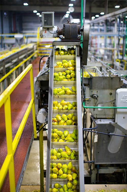 All canned pears start as a half – perfect halves proceed to canning; while imperfect halves are diverted to the slice line. The slices are then sorted again, with flawless slices moving to the canning line, and blemished slices sent to the diced pear line. The most perfect dices are canned and any leftover pear pieces are saved for pear concentrate, a neutral juice that is a component in most commercial juice products. Any non-useable product is collected for cattle feed, so that all of the pear is used, ensuring minimal waste.
