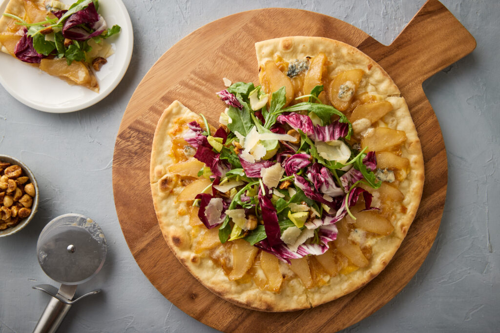 Caramelized Pear & Gorgonzola Pizza with Tricolore Salad