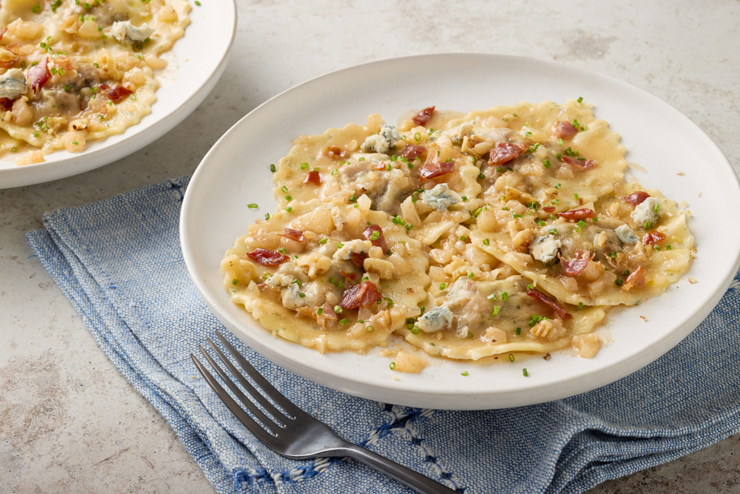 Plate ravioli and top with sauce. Garnish with walnuts, chives, prosciutto and gorgonzola crumbles.